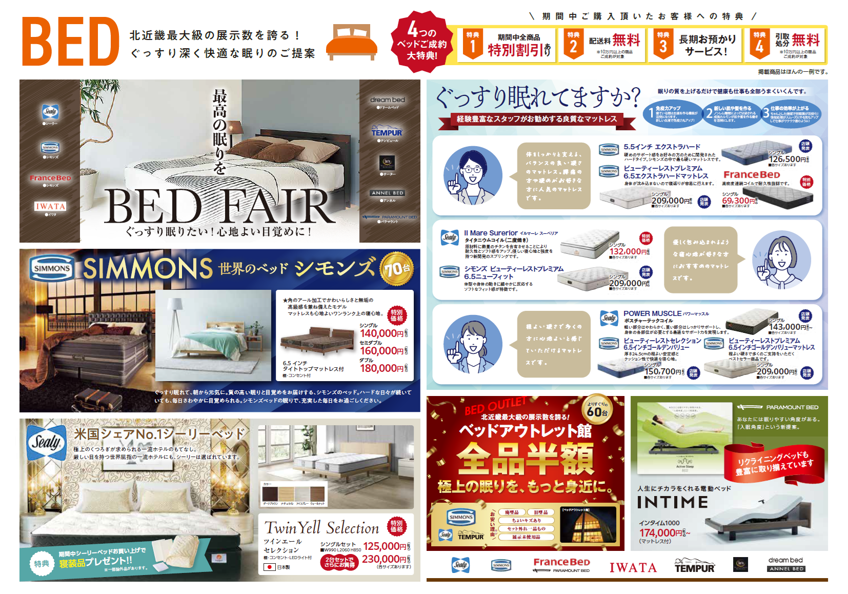 さらに、北近畿最大級の展示数を誇る「ベッドアウトレット館」では、全品半額。